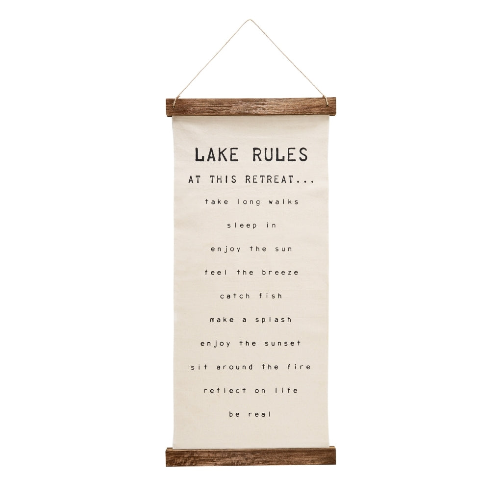 Printed sentiment canvas features mango wood weights and cotton rope loop hanger. |